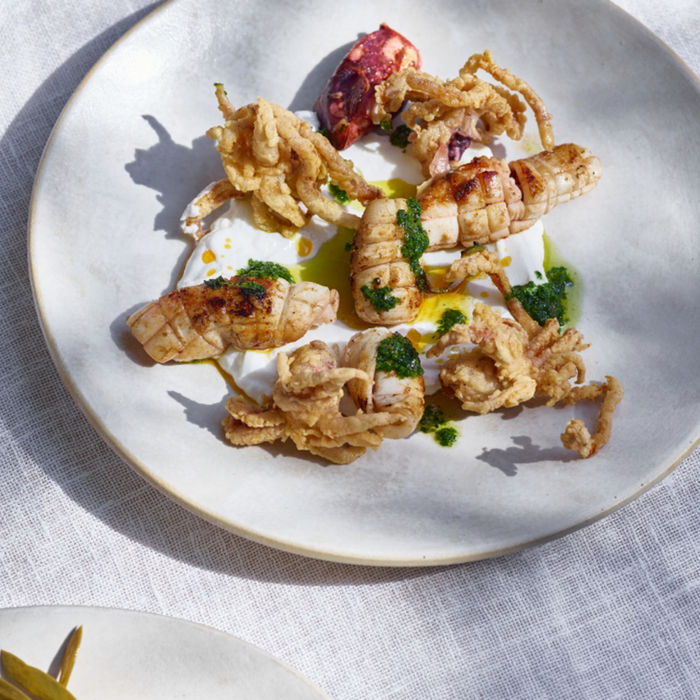 שרימפס קלמרי ומולים בקרם פלפלים קלויים מרטיני ואבן יוגורט